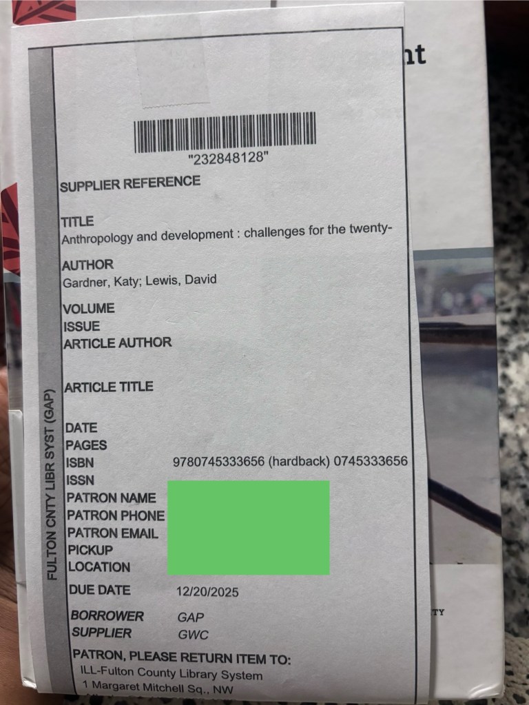 My Interlibrary Loan request arrived earlier this week at my local library. I got an email notification, asking to contact the front desk ie. it will not be in the usual “holds” shelf. Except – I had already bought a second-hand copy of the book (Anthropology and Development by Katy Gardner and David Lewis) off the Better World Books website and didn’t need the loan anymore.